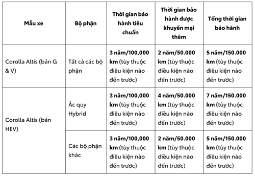 Toyota Việt Nam tiếp tục triển khai chương trình ưu đãi tặng “Gói gia hạn bảo hành 2 năm hoặc 50.000 km (tùy điều kiện nào đến trước)” dành cho khách hàng mua xe Toyota Corolla Altis đến hết ngày 31/12/2023. Chương trình được áp dụng với tất cả các phiên bản, thông tin cụ thể như sau: