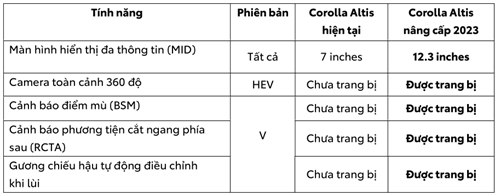Thông tin chi tiết về những nâng cấp trên các phiên bản của Corolla Altis 2023 như sau: